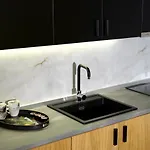 設備の整った台所も完備しています。 宿泊施設から150メートルほどのFrigoriferiバス停からバスに乗って、ティラナの他の地域を探索することもできます。